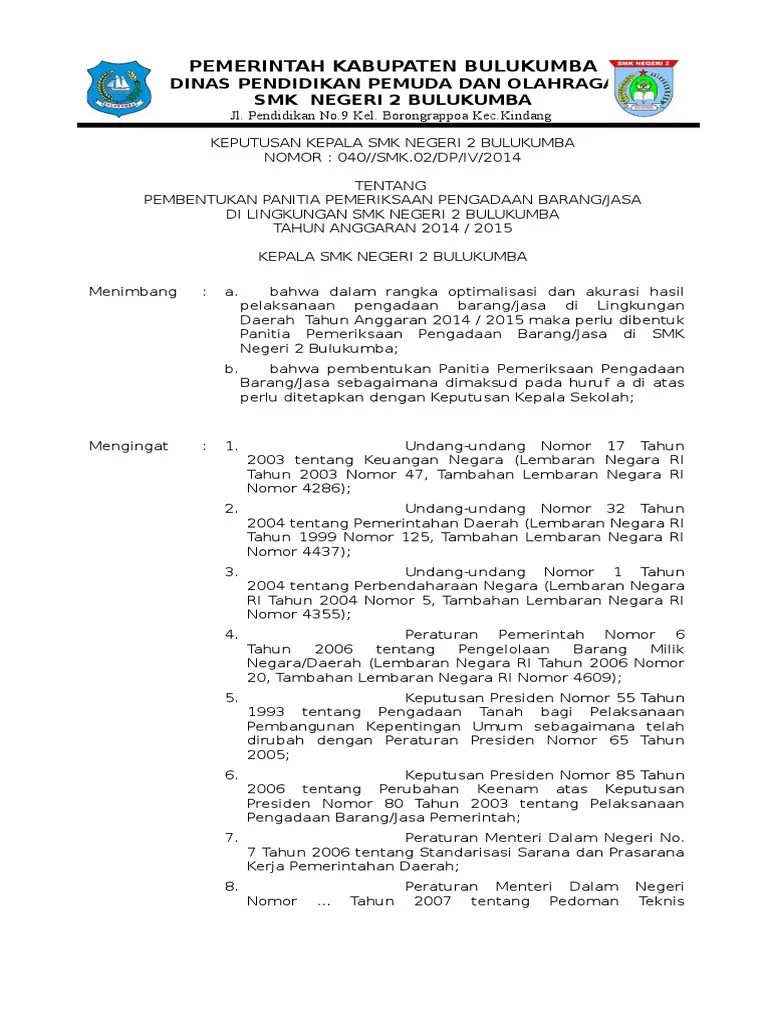 Contoh Sk Panitia Pengadaan Bangunan Sekolah / Contoh Surat Keputusan Acara Contoh Surat / Artinya kepala sekolah dapat menunjuk pendidik (guru) tenaga.. 23 agustus 2017 kepala sekolah mi . Surat keputusan (sk) pembentukan perpustakaan sekolah ditandatangani oleh kepala. Dan jasa corona pengadaan barang dan jasa contoh pengadaan barang dan jasa . Contoh, prasarana pendidikan berarti alat tidak langsung untuk mencapai tujuan dalam pendidikan misalnya, lokasi, bangunan sekolah, lapangan olahraga . Tugas dan tanggung jawab panitia pembangunan mi riyadlus sholihin.
